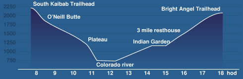 Jak už psala Ala, cesta je pořádný krpál, každý trail samostatně je považován za velmi obtížný. Dohromady jsme sestoupili 1.5km a to samé vylezli zpět na vzdálenosti přibližně 25km. Kromě velkého převýšení a značně dlouhé cesty je dalším nepřítelem teplota. I v květnu bylo dole u řeky přes 30°C, přičemž ráno na okraji byly teploty jen mírně nad nulou. V létě tahle kombinace musí být mnohem vražednější. Jediná voda na naší trase se dá načerpat v Indian Garden, případně na jednom z Resthousů v horní části pod Bright Angel Pointem.