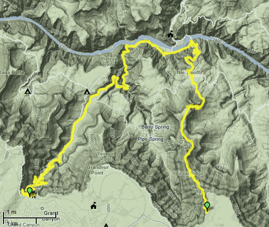 Výstupem zpět ale moje sportovní výkony ten den neskončily. Kolegiálně jsem se nabídla, že cestu do kempu odřídím (v parku je totiž nejvyšší povolená rychlost 40mil/h, což mi přišlo pro můj první pokus za volantem bezpečné). Po mém parkovacím manévru Roman ihned v autě usnul. Já hnaná hygienou a fiaskem u Colorada jsem se rozhodla, že ještě navštívím místní sprchu, na plánku zakreslenou u recepce. Romana jsem nechala spát v autě, sbalila batoh a pěšky se vydala ke sprše. Byl to dobrý kilometr, ale umyté tělo mi za to stálo. Když jsem pak zjistila, že sprcha je za peníze a že jsem peněženku nechala ve stanu, nejdřív se o mě pokoušel hysterický záchvat. Pak jsem se uklidnila a udělala ještě jedno kolečko - auto - sprcha - auto a to poklusem, abych to stihla před zavíračkou ve 23.00. Suma sumárum po kempu 4 kilometry, sprchu jsem stihla a padla do stanu, kde jsem hibernovala (jinak se to nazvat nedá) 6 hodin. Pak jsem si přelezla do auta a rozmrazovala se další 3 hodiny u topení. Navzdory tomu (nebo právě proto) na tento výlet budeme ještě dlouho vzpomínat. Superstition Mountains - Cestování po Americe - Zion National Park PodrobnostiDo oblasti Grand Canyonu jsme dorazili den předem navečer, zaplatili obligátní vstupné $25 za naše auto a ubytovali se v kempu jménem Mather Campground. Poplatek v kempu byl kolem $10, za parkovací a kempovací místo. Američani obvykle kempují v plně vybavených karavanoautech, zvaných RV, náš stan byl celkem rarita, i když se nikdo nedivil. Cestu jsme zvolili tak, abychom se nemuseli vracet stejnou cestou. Naše trasa jsou vlastně spojené tři traily dohromady. První je South Kaibab Trail, který vede do kempu na druhé straně řeky. Další je trail, který vede spodem kolem řeky, jméno už si nepamatuju, ale šli jsme po něm jen kousek. Poslední se jmenuje Bright Angel Trail, který vede dolů vedlejší skalní rozsochou. Celkem dobře je to vidět na následující mapce, žlutě je naše cesta.