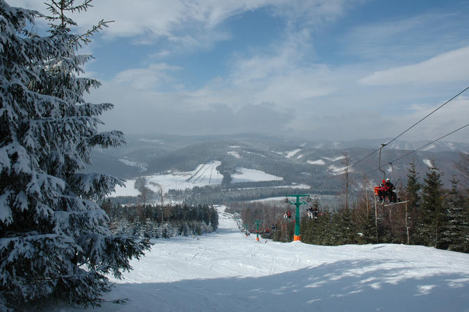 Spodní část Ramzovské sjezdovky. Na protější stráni vlek U Vočka