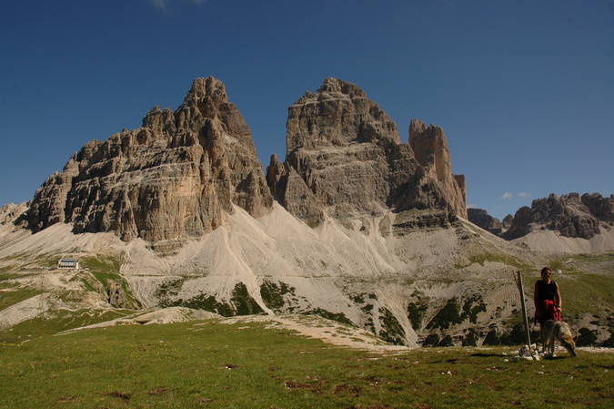 Údolí pod Tre Cime, vlevo chata Rifugio Auronzo